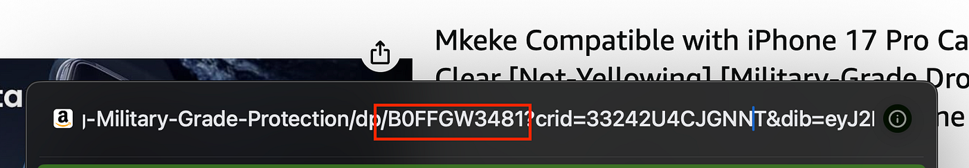 https://www.amazon.com/Mkeke-Compatible-Not-Yellowing-Military-Grade-Protection/dp/B0FFGW3481?crid=33242U4CJGNNT&dib_tag=se&keywords=phone%2Bcase%2Biphone%2B17%2Bpro&qid=1759094060&sprefix=phone%2Bcase%2Caps%2C173&sr=8-3&th=1However, if you extract the ASIN from that long url here: